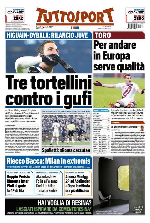 Tuttosport apre con una prima pagina dedicata a Juventus e Torino. Da un lato si esaltano le prestazioni di Higuain e Dybala che con i loro goal hanno sconfitto la compagine di mister Donadoni. Dall’altra invece si lamenta di un Torino poco incisivo che si è fermato ad un pari col Sassuolo: “Per andare in Europa serve qualità“.