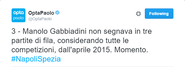 A certificare il momento magico del talento di Calcinate, ci ha pensato l’Istituto Opta in un tweet apparso sul proprio account ufficiale, con un dato particolare riferito proprio alle gare consecutive in cui è andato a segno Gabbiadini.