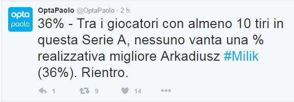 Un fattore è ancora più impressionante e corrobora la tesi sulla enorme qualità del centravanti partenopeo. Secondo quanto riferito dall’azienda leader nel settore delle statistiche sportive, OPTA, Milik detiene un record in Serie A. Tra i giocatori con almeno 10 tiri in questa Serie A, nessuno vanta una percentuale realizzativa elevate come quella del polacco: 36% dei suoi tiri si trasforma in goal. In pratica quasi quattro marcature ogni 10 tiri. Bentornato Arkadiusz, questo Napoli con te è ancora più pericoloso per gli avversari.