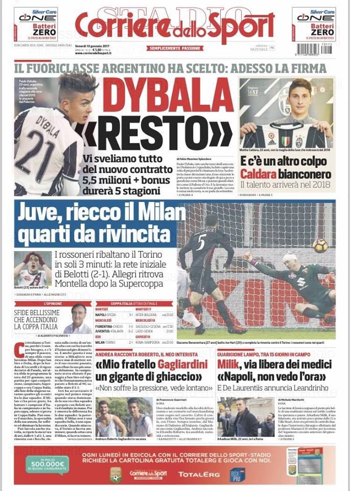 Il Corriere dello Sport si focalizza sull’asso argentino della Juventus: “Dybala ‘Resto’ “. In basso a destra anche le parole di Milik : “Napoli, non vedo l’ora”.