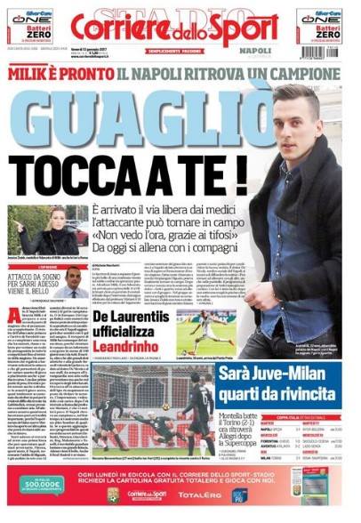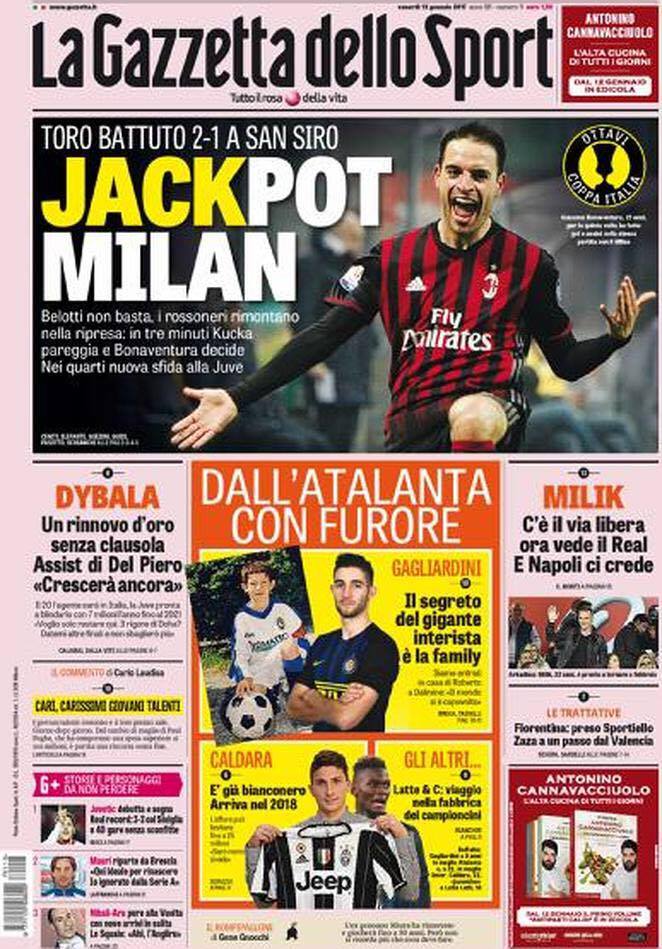 La Gazzetta dello Sport titola “Jackpot Milan” giocando sull’uomo chiave del match, ossia Giacomo Bonaventura. Sulla destra anche il recupero di Milik, che ora è disponibile per il Real.