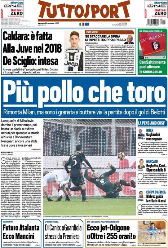Diversa, invece, l’interpretazione della sfida di San Siro di Tuttosport. “Più pollo che toro” il titolo del quotidiano, che mette l’accento sull’occasione persa da Belotti e compagni.