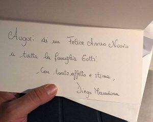 Il capitano della Roma ha poi postato alcune immagini sul suo profilo Facebook, svelando il contenuto del biglietto: “Auguri di un felice anno nuovo a tutta la famiglia Totti, con tanto affetto e stima“. Firmato, naturalmente, Diego Maradona.