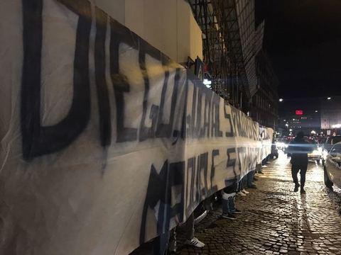 Maradona al San Carlo, per “Tre Volte Dieci“, manca ormai pochissimo. Tuttavia, all’esterno del prestigioso teatro un gruppo di tifosi, facenti capo al gruppo storico del tifo partenopeo, i “Fedayn 1979“, hanno voluto sì omaggiare il Pibe de Oro ma anche lanciare una frecciatina agli organizzatori dell’evento, invitando poi lo stesso fenomeno argentino ad una futura esibizione, accessibile anche a quel popolo che ancora oggi rappresenta, in quello che è il vero tempio di Diego: il San Paolo.