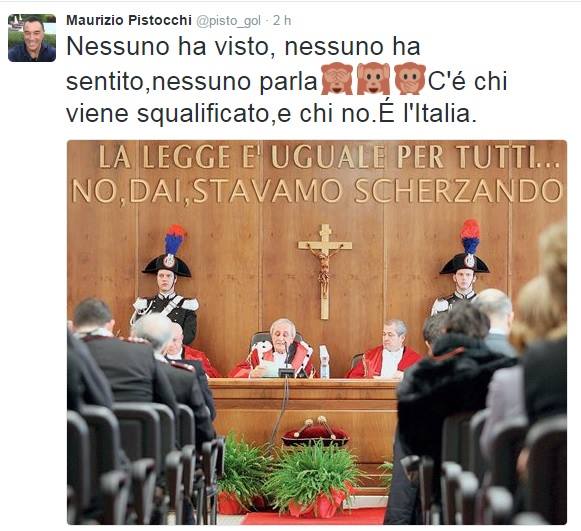 Ed il noto giornalista Maurizio Pistocchi ha pubblicato una foto sul suo profilo Twitter ufficiale, accompagnata da un chiarissimo messaggio: “Nessuno ha visto, nessuno ha sentito,nessuno parla🙈🙉🙊C’é chi viene squalificato,e chi no.É l’Italia”.