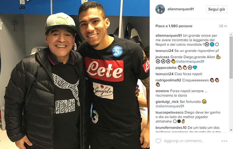 Dopo Jorginho, Sepe e Rafael, infatti, anche Allan ha voluto pubblicare su Instagram il prezioso cimelio fotografico in compagnia del campione argentino, dedicandogli una frase che lascia poco spazio all’interpretazione: “Un grande onore per me avere incontrato la leggenda del Napoli e del calcio mondiale!!”