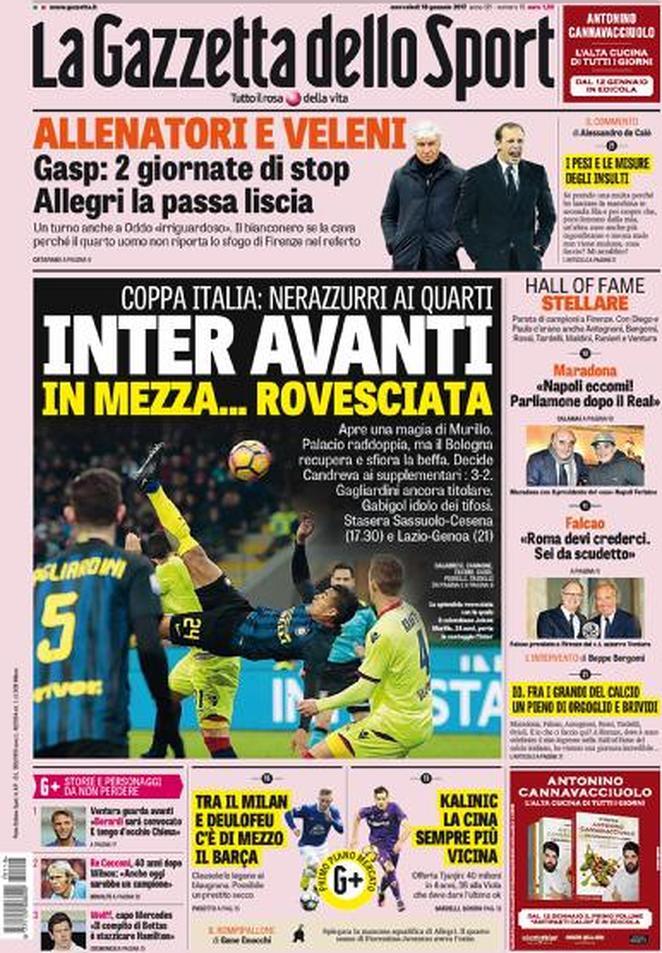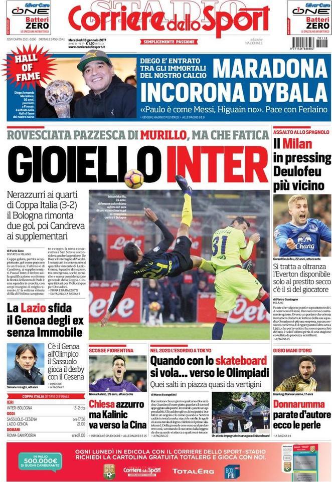 Sulla Gazzetta dello Sport si apre con “Inter avanti in mezza… rovesciata“, sottolineando il passaggio del turno in Coppa Italia dei nerazzurri e, soprattutto, l’eurogol in rovesciata di Murillo. In taglio alto approfondimento sulle decisioni del giudice sportivo, mentre di spalla spazio a Maradona: “Napoli eccomi! Parliamone dopo il Real“. In taglio basso il mercato con Kalinic e le sirene cinesi e il Milan su Deulofeu.