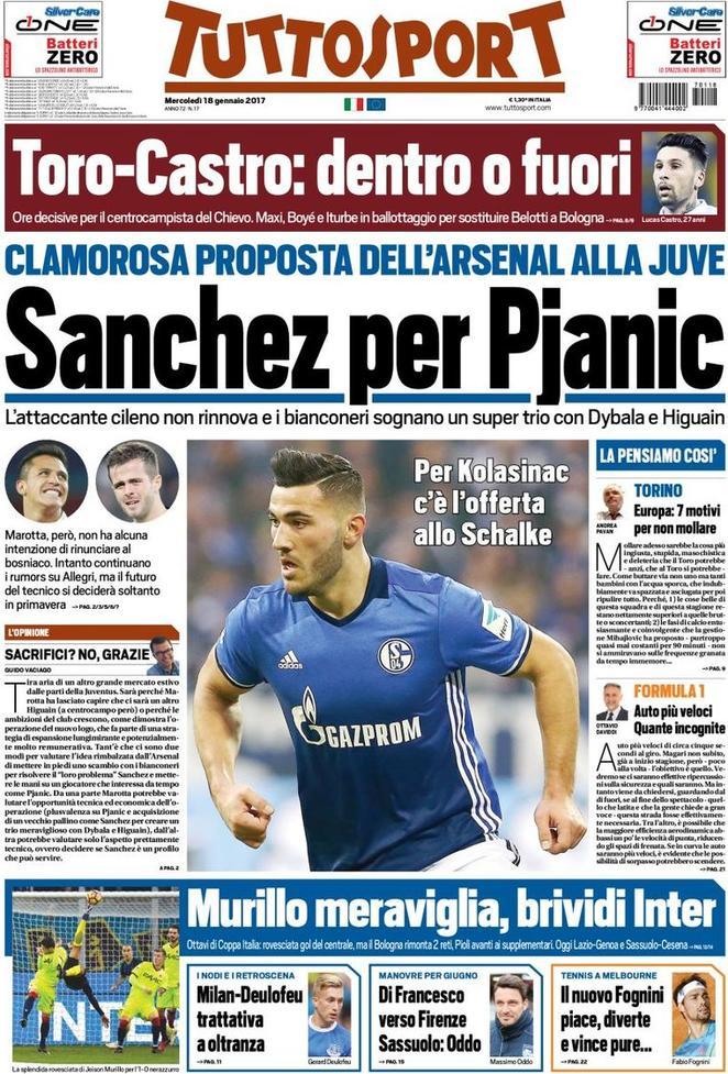 Su Tuttosport invece apertura con tanto di bomba di mercato: “Sanchez per Pjanic, clamorosa proposta dell’Arsenal alla Juve“. In taglio alto spazio al Torino e all’affare Castro. In taglio basso la Coppa Italia e l’Inter: “Murillo meraviglia, brividi Inter“. Chiusura ancora con il mercato: “Milan-Deulofeu, trattativa ad oltranza. Panchine, movimenti per giugno: Di Francesco verso Firenze, Sassuolo-Oddo“.