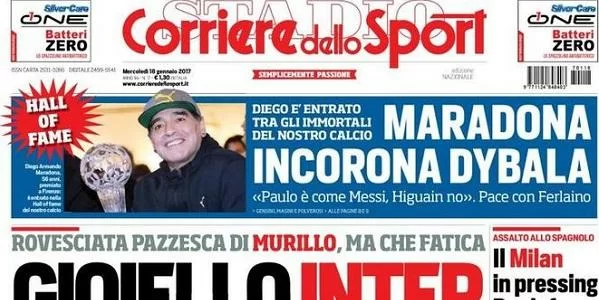 Anche sul Corriere dello Sport apertura dedicata alla Coppa Italia con “Gioiello Inter. Rovesciata pazzesca di Murillo, ma che fatica“. In taglio alto spazio a Maradona e le sue dichiarazioni alla Hall of Fame di Firenze: “Maradona incorona Dybala. Paulo è come Messi, Higuain no. Pace con Ferlaino“.