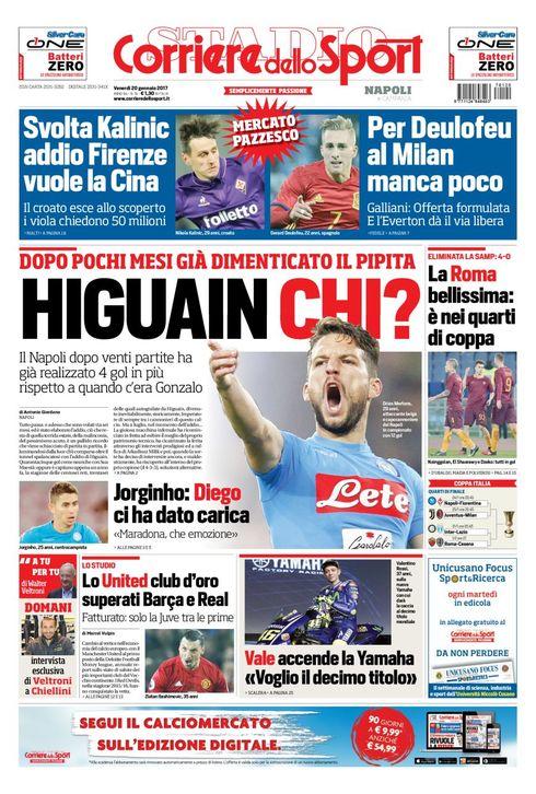 Sono online le prime pagine dei principali quotidiani sportivi italiani. Il Corriere dello Sport esalta le ultime prestazioni di Dries Mertens e del Napoli, che dopo venti partite è riuscito a totalizzare 4 reti in più anche senza Higuain. Spazio anche alle emozioni di Jorginho dopo aver incontrato Maradona a Castel Volturno: “Che emozione. Diego ci ha dato la carica”. In taglio alto si parla di mercato con Kalinic che ha svelato di voler raggiungere la Cina, mentre Delofeu si avvicina al Milan dopo il via libera dell’Everton.