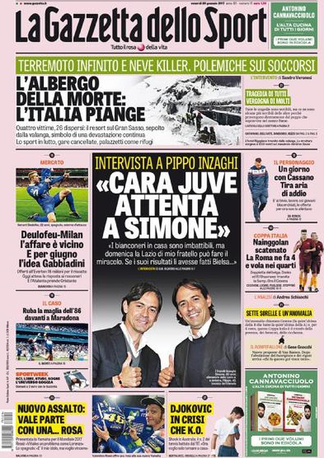 Sulla Gazzetta dello Sport c’è un’intervista esclusiva a Filippo Inzaghi che mette in guardia la Juventus, prossima avversaria della Lazio di suo fratello: “Cara Juve, attenta a Simone. Domenica può fare il miracolo”. Di spalla ancora le voci del mercato, col Milan che starebbe pensando a Gabbiadini per giugno; problemi invece per Cassano alla Sampdoria poiché sembra ormai prossimo il suo addio ai blucerchiati. Infine spazio anche alla tragedia nell’hotel sul Gran Sasso dopo che la terra è tornata a tremare: per ora si contano 4 vittime, mentre sono 26 le persone ancora disperse nella tragica valanga.