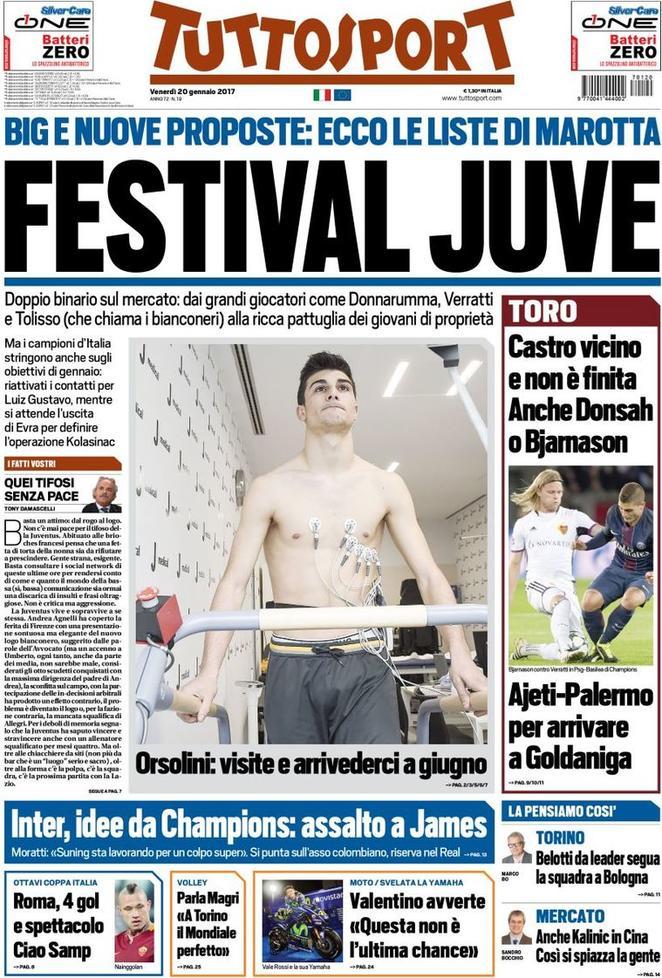 Tuttosport dedica la prima pagina a Riccardo Orsolini, talento dell’Ascoli acquistato dalla Juventus. Il giovane centrocampista ha svolto già le visite mediche col nuovo club, che raggiungerà definitivamente a giugno. Spazio anche al mercato del Torino che, oltre a vedere Castro avvicinarsi, è pronto a formulare una proposta al Palermo per accaparrarsi Goldaniga. In basso si parla anche di Inter: i nerazzurri vogliono assicurarsi James Rodriguez del Real Madrid, per un colpo che avrebbe del sensazionale.