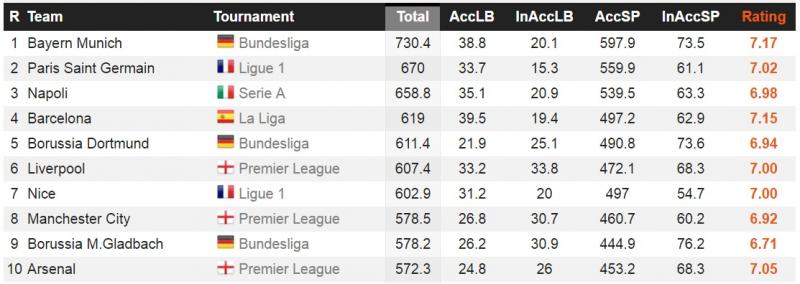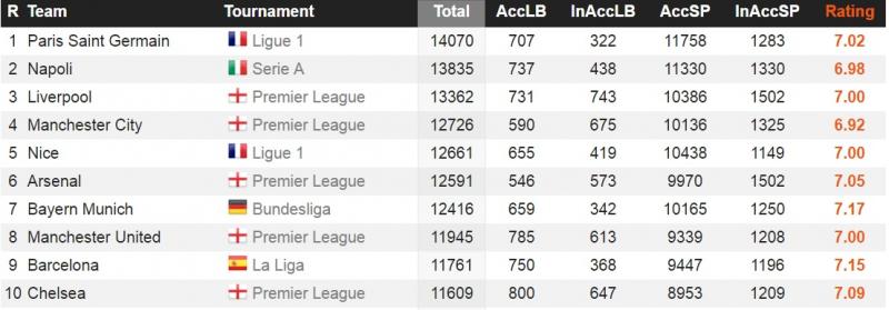 Stiamo parlando di media passaggi: secondo la classifica che potete consultare in basso, il Napoli, per passaggi realizzati di media in partita in Europa, supera addirittura colossi come Barcellona e Real Madrid. Meglio degli azzurri solo il Bayern Monaco ed il PSG: 730.4 passaggi completati per i bavaresi di Ancelotti, 670 per i parigini, 658.8 per gli azzurri.