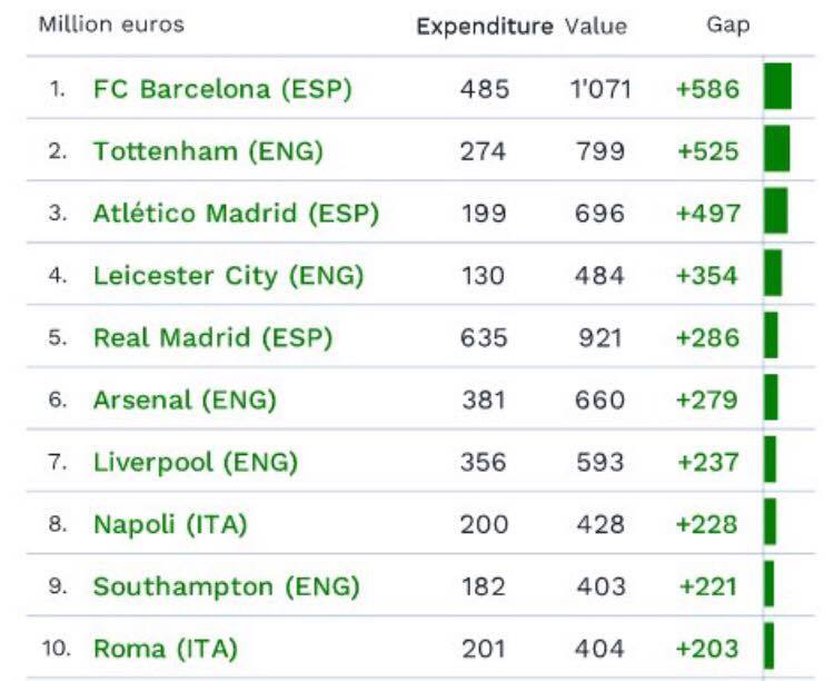 Secondo l’analisi svolta da Calcio e Finanza gli azzurri sono l’ottavo club in Europa per valorizzazione della rosa. Lo studio ovviamente non tiene conto delle risorse spese per i nuovi acquisti; l’analisi si basa solo sul valore relativo alla crescita di prezzo dei calciatori. E in tal senso la crescita della rosa azzurra è impressionante: dai 200 milioni iniziali del valore si è giunti a 428 milioni. Un saldo positivo di 228 milioni davvero impressionante. Dietro gli azzurri si difende bene anche la Roma, con un incremento di 208 milioni. Al primo posto si radicano i marziani del Barcellona, con la crescita esponenziale dei valori di mercato dei vari Messi e Neymar.