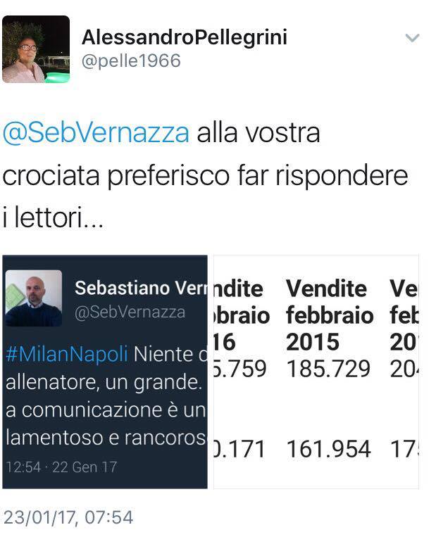 AGGIORNAMENTO – Il collega della Rosea Sebastiano Vernazza non ha fatto attendere la sua risposta, come potete vedere dal tweet postato poco fa. Laconica la risposta di Pellegrini: “TW muto….”.