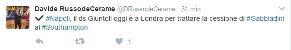 Tra i più attivi in queste ore c’è il d.s. del Napoli, Cristiano Giuntoli, che deve trovare una soluzione alla “questione Gabbiadini“. L’attaccante è ormai fuori dal progetto tecnico, e i recuperi di Pavoletti e Milik di certo non lo agevoleranno. Tra i club più interessati al giocatore c’è il Southampthon, ecco perché il d.s. è volato a Londra per trattare con la società inglese. A confermarlo è il giornalista de Il Corriere dello Sport, Davide Russo De Cerame, con un post sul proprio profilo Twitter.