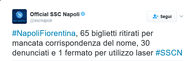 Come si legge sul profilo Twitter ufficiale della SSC Napoli, ieri sono stati ritirati un gran numero di tagliandi il cui nome non corrispondeva alla reale identità del proprietario. Questo il testo totale: “Napoli-Fiorentina, 65 biglietti ritirati per mancata corrispondenza del nome, 30 denunciati e 1 fermato per utilizzo laser”.