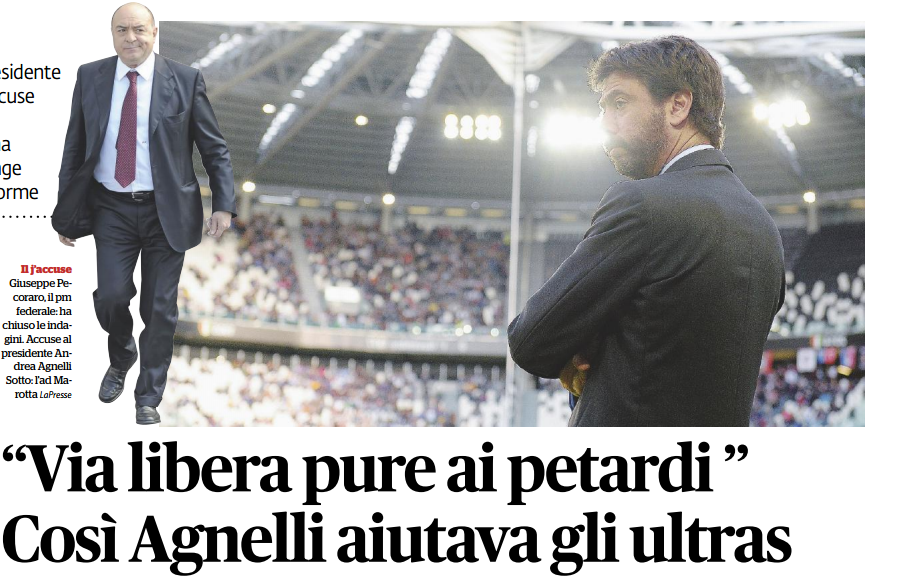 In evidenza il rapporto con ultras e malavita, sviscerando in particolare i riferimenti ad una data specifica: “Pecoraro (il procuratore Federale) attribuisce al presidente Agnelli frequentazioni imbarazzanti e una responsabilità diretta (che ricade poi sulla Juventus) per i rapporti con gli ultras che, secondo la magistratura, macinavano denaro con l’irregolare vendita dei tagliandi: “(Agnelli) ha favorito, consapevolmente, il fenomeno del bagarinaggio, partecipando personalmente, inoltre, in alcune occasioni, a incontri con esponenti della malavita organizzata e della tifoseria ultras e assecondando (questo è il passaggio inedito, ndr), in occasione della gara Juventus-Torino del 23.02.2014, l’introduzione all’interno dell’impianto sportivo, a opera di D’Angelo, di materiale pirotecnico v