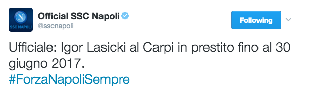 Era nell’aria da qualche giorno, ora è arrivata anche l’ufficialità: il Napoli, attraverso il proprio profilo Twitter, comunica che il difensore polacco Igor Lasicki è stato ceduto in prestito al Carpi fino al prossimo 30 giugno.
