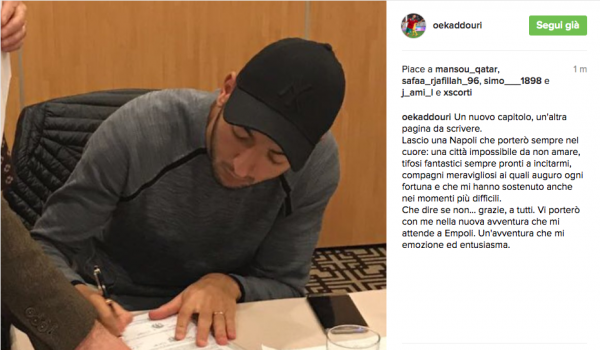 Il calciatore si trasferisce a titolo definitivo ad Empoli, e qualche minuto fa ha scritto sul suo profilo Instagram un bellissimo messaggio di ringraziamento per Napoli e i tifosi del Napoli.