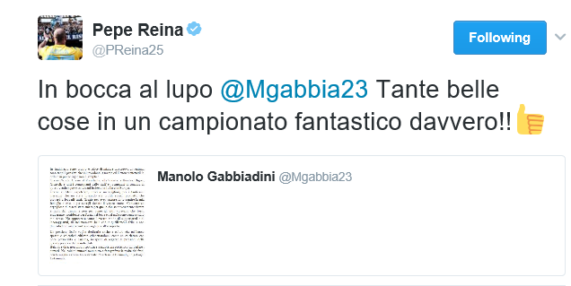 Pochi minuti fa, Reina ha voluto salutare anche Gabbiadini. E lo ha fatto attraverso il proprio profilo Twitter, postando la lettera dello stesso Manolo e salutandolo con una frase: “In bocca al lupo Gabbiadini. Tante belle cose in un campionato fantastico davvero!!”