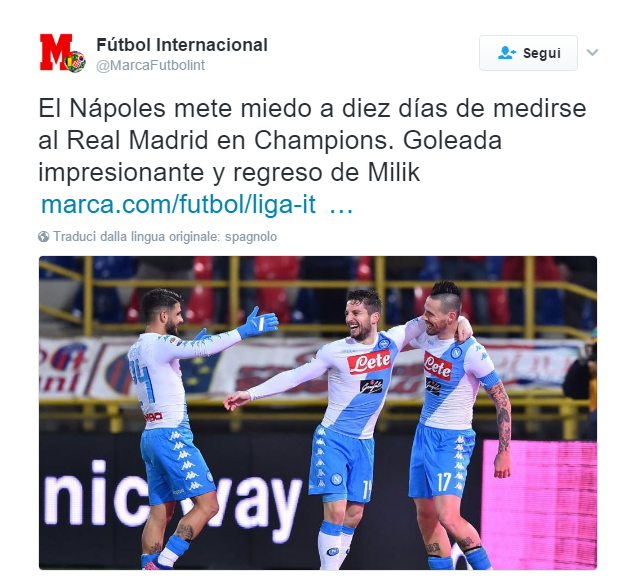 Anche Marca se n’è accorto. L’account twitter (quello dedicato al calcio internazionale) del quotidiano spagnolo celebra l’1-7 degli azzurri al Dall’Ara: “Il Napoli mette paura al Real Madrid a dieci giorni dalla partita. Goleada impressionante e ritorno di Milik” scrive sui social il quotidiano.