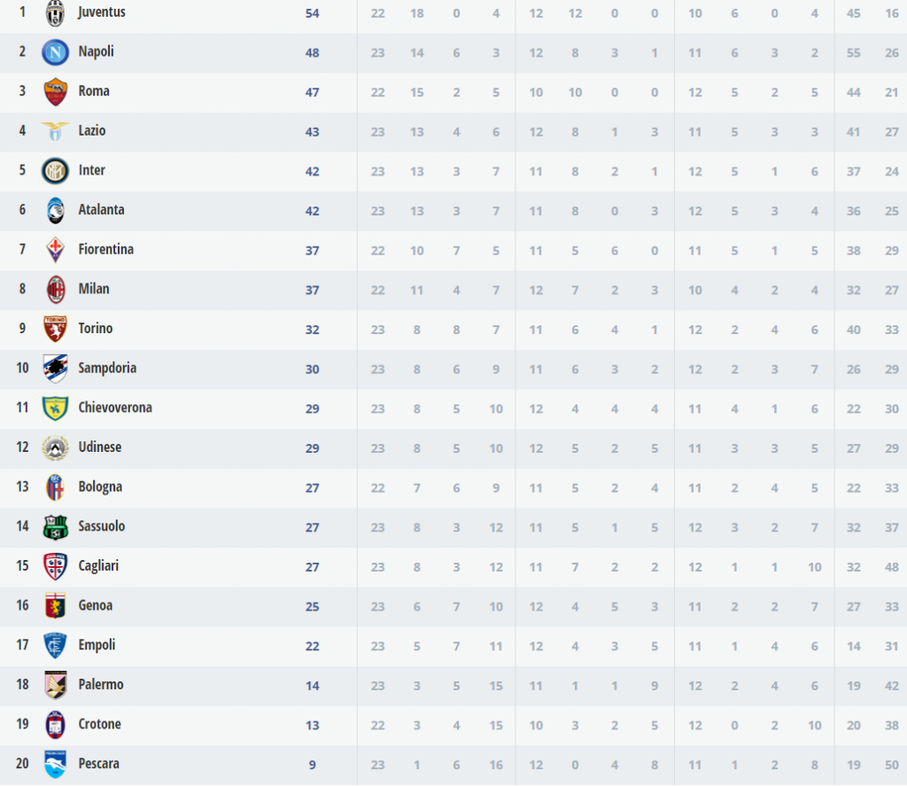 Alle 18 il Palermo ha battuto 1-0 con gol del solito Nestorovski. Nel posticipo serale la Juventus batte l’Inter 1-0 con gran gol di Cuadrado al 45′. Nerazzurri che reclamano due rigori nel primo tempo.