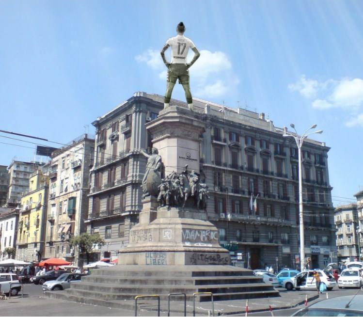 La cosa non è passata inosservata e i tifosi azzurri hanno voluto renderlo una statua vera e propria. Come si vede da un fotomontaggio che sta circolando sui social in queste ore, realizzato dal grafico Danilo Pergamo, Hamsik è stato piazzato al posto della statua di Garibaldi situata in Piazza Mancini.