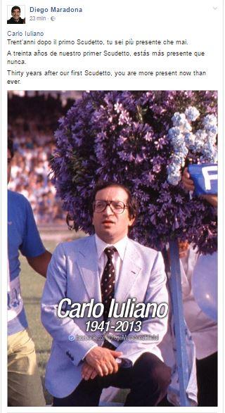 Diego Armando Maradona sul suo profilo Facebook ha pubblicato un breve e significativo post per il suo amico. Queste le sue parole: “Carlo Iuliano. Trent’anni dopo il primo Scudetto, tu sei più presente che mai“.