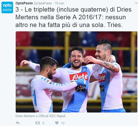 Secondo quanto riferito da OptaPaolo, il belga ha fatto qualcosa in più di essere il capocannoniere della Serie A. Le triplette (incluse quaterne) di Dries Mertens nella Serie A 2016/17 sono tre. Nessun altro ne ha fatta più di una sola.