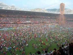 Il risultato maturato a Piacenza permise ad azzurri e rossoblù (tifoserie gemellate da tempo) di poter festeggiare insieme l’approdo in Serie A. E si videro scene da film: El Pampa Sosa che abbracciava un suo avversario in campo con il match ancora in corso, Masiello del Genoa che giocò gli ultimi minuti finali senza maglia e, soprattutto, l’invasione di campo finale con la festa dei tifosi: un mix di colori, due popoli uniti ed un unico grido: SERIE A!