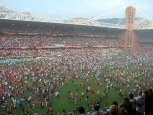 Il risultato maturato a Piacenza permise ad azzurri e rossoblù (tifoserie gemellate da tempo) di poter festeggiare insieme l’approdo in Serie A. E si videro scene da film: El Pampa Sosa che abbracciava un suo avversario in campo con il match ancora in corso, Masiello del Genoa che giocò gli ultimi minuti finali senza maglia e, soprattutto, l’invasione di campo finale con la festa dei tifosi: un mix di colori, due popoli uniti ed un unico grido: SERIE A!