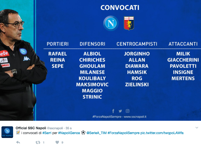Attraverso il proprio profilo Twitter, il Napoli ha diramato la lista dei convocati per il match di stasera con il Genoa. Mancano all’appello Lorenzo Tonelli, che ha svolto lavoro differenziato per tutta la settimana, Elseid Hysaj e Josè Callejon, squalificati. In difesa convocato il giocane Milanese.