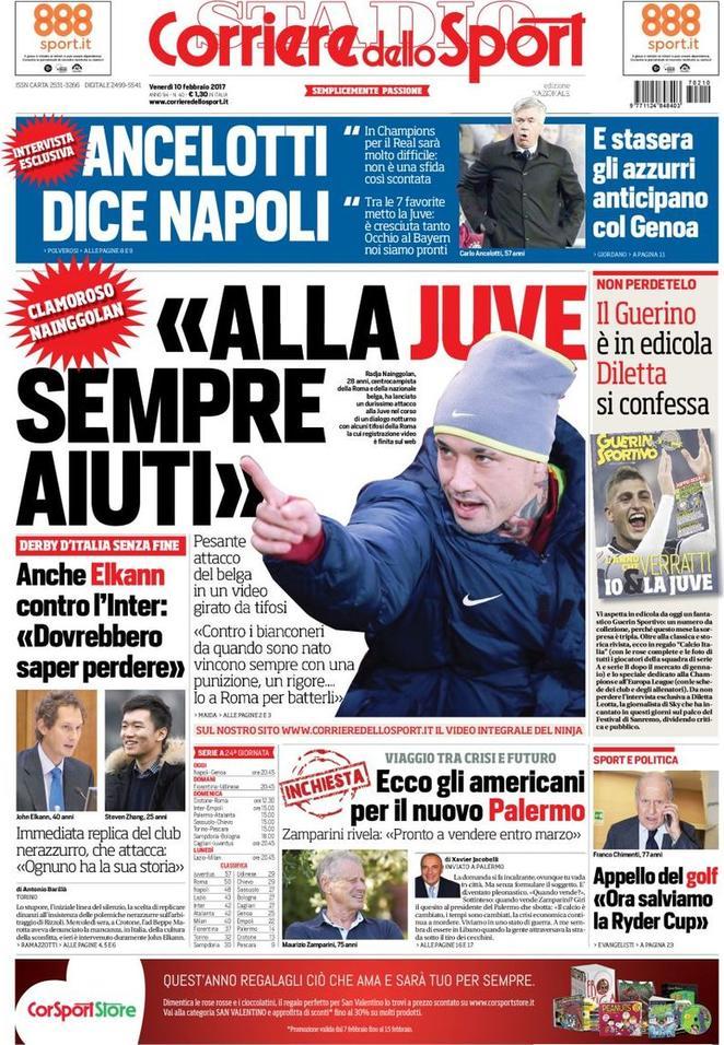 Sul Corriere dello Sport il titolo in prima pagina è: “Alla Juve sempre aiuti“, che riprende lo sfogo di Nainggolan con alcuni tifosi. In alto l’intervista ad Ancelotti, “Ancelotti dice Napoli“. Infine, le parole polemiche di Elkann e gli strascichi di Juve-Inter.