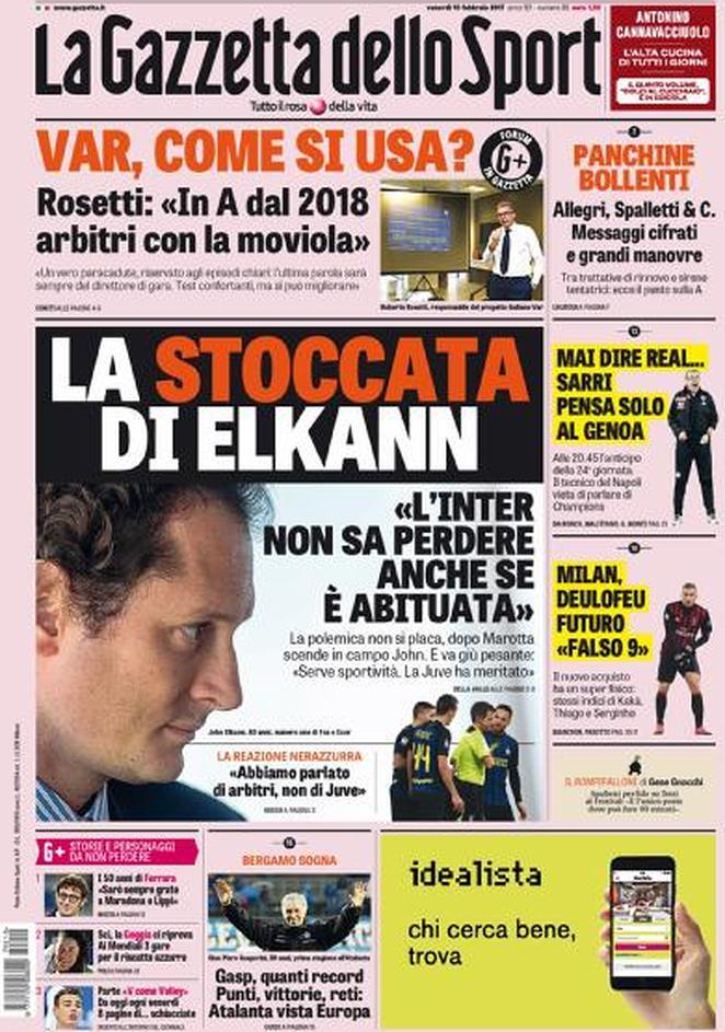 La Gazzetta dello Sport dedica la propria prima pagina a “La stoccata di Elkann“. “Var, come si usa?” è invece il taglio alto. Il titolo sul Napoli è: “Mai dire Real… Sarri pensa solo al Genoa“.