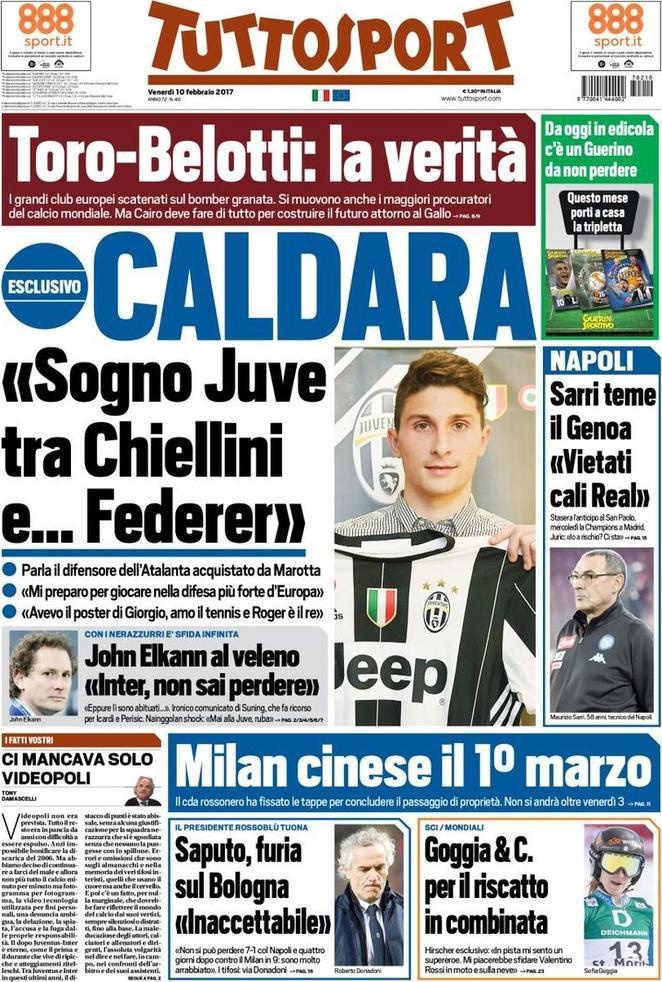 Tuttosport apre con l’intervista a Caldara: “Sogno Juve tra Chiellini e… Federer“. In taglio alto “Toro-Belotti: la verità“. Infine le parole di Sarri in vista del match contro il Genoa: “Vietati cali Real“.