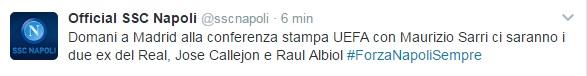 Ad affiancarlo saranno proprio i due ex calciatori del Real, Raul Albiol e José Callejon. “Domani a Madrid alla conferenza stampa UEFA con Maurizio Sarri ci saranno i due ex del Real, Jose Callejon e Raul Albiol #ForzaNapoliSempre“, questo il tweet del club.