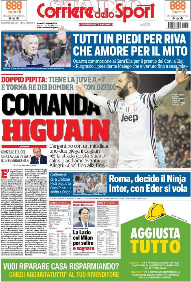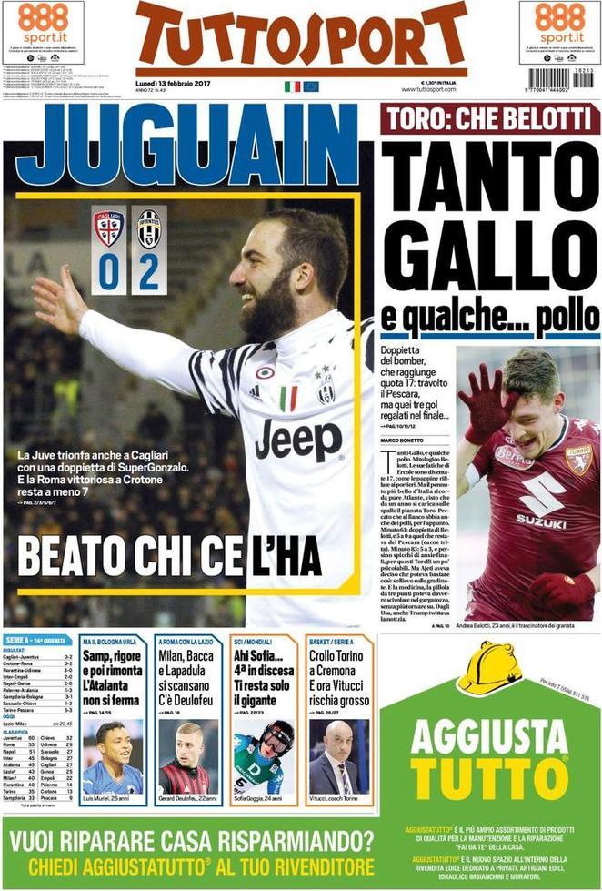 Le prime pagine sportive dei quotidiani che troveremo tra poche ore in edicola, si concentrano perlopiù sui temi della 24esima giornata di campionato. In copertina, quasi univocamente, Higuain e la doppietta che ha permesso alla Juventus di avere la meglio del Cagliari nel posticipo serale di Serie A.