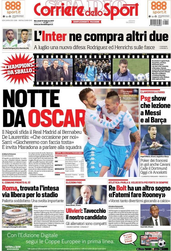 Sul Corriere dello Sport invece si parla di: “Notte da Oscar“. Ovvero quella che attende il Napoli al Bernabeu, inoltre vengono riportate le parole di Sarri e De Laurentis che caricano il gruppo.