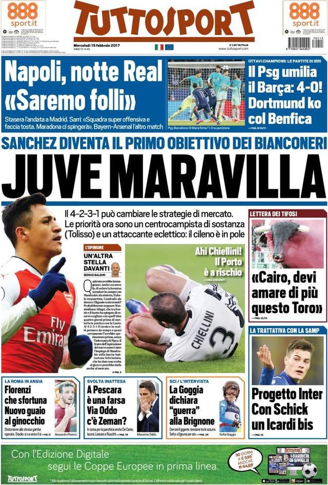 Per Tuttosport è già tempo di calciomercato con la Juventus che ha in mente Alexis Sanchez come primo obiettivo offensivo per l’estate: “Juve Maravilla“. Poi spazio al Napoli in taglio alto: “Notte Real“.