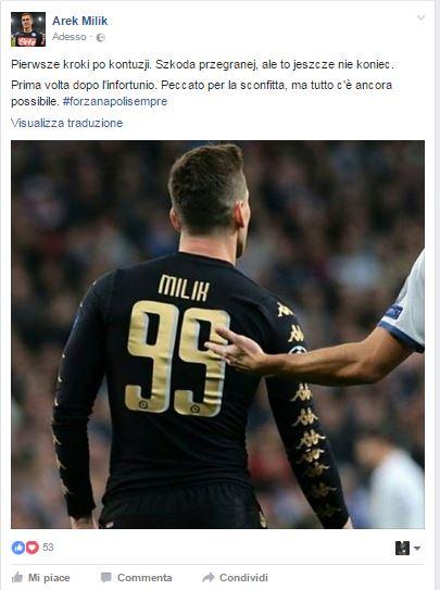 Arek Milik non si è mai arreso e ieri ha esordito alla grande. Sebbene il risultato finale sia stato negativo, il morale è sicuramente alto. Il suo battesimo lo ha ricevuto contro il Real Madrid al Bernabeu. Il numero 99 azzurro ha voluto commentare su Facebook le emozioni dopo il lungo stop: