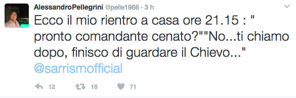 “Ecco il mio rientro a casa ore 21.15 : “Pronto comandante, cenato?””No… Ti chiamo dopo, finisco di guardare il Chievo…””: questo il tweet di Pellegrini. A dimostrazione che, il tecnico partenopeo, non lesina impegno nel suo lavoro.