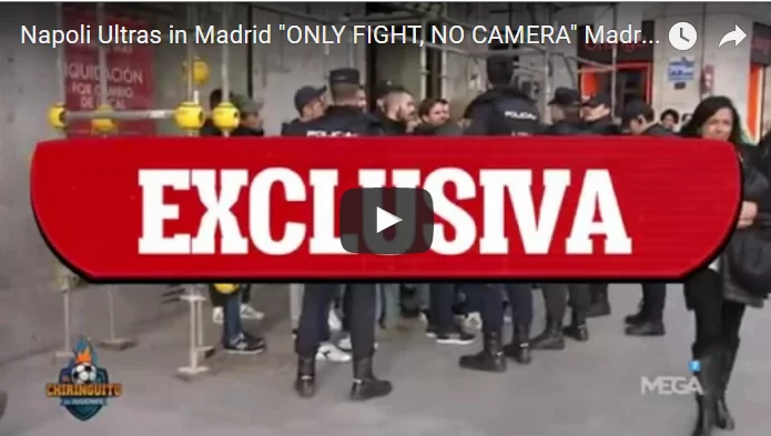 Su Youtube è stato pubblicato un video in cui gli ultras partenopei vengono ripresi per le strade di Madrid. I tifosi azzurri, apparsi evidentemente infastiditi dalle telecamere, si rivolgono al reporter spagnolo chiedendo di non essere ripresi: “Only fight, no camera” (Solo lotta, niente riprese) si sente durante il servizio. Poi i controlli della polizia e l’ingresso dei supporter al Bernabeu.