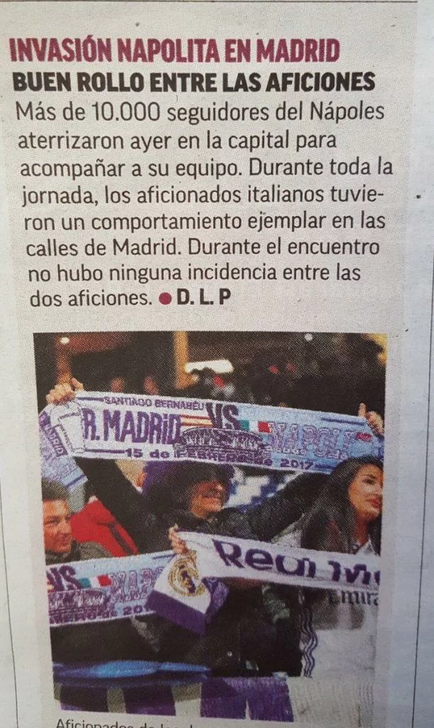 Oltre 10mila i napoletani presenti nella capitale spagnola che hanno sostenuto con cori costanti la squadra. La cosa non è passata inosservata, almeno in Spagna. Ed ecco che alcuni quotidiani spagnoli hanno elogiato il comportamento dei napoletani. A metterlo in evidenza è stato il giornalista Maurizio Pistocchi che, con un post su Twitter, ha voluto anche bacchettare i media italiani, rei di non aver dato particolare risalto all’esemplare comportamento dei tifosi del Napoli.