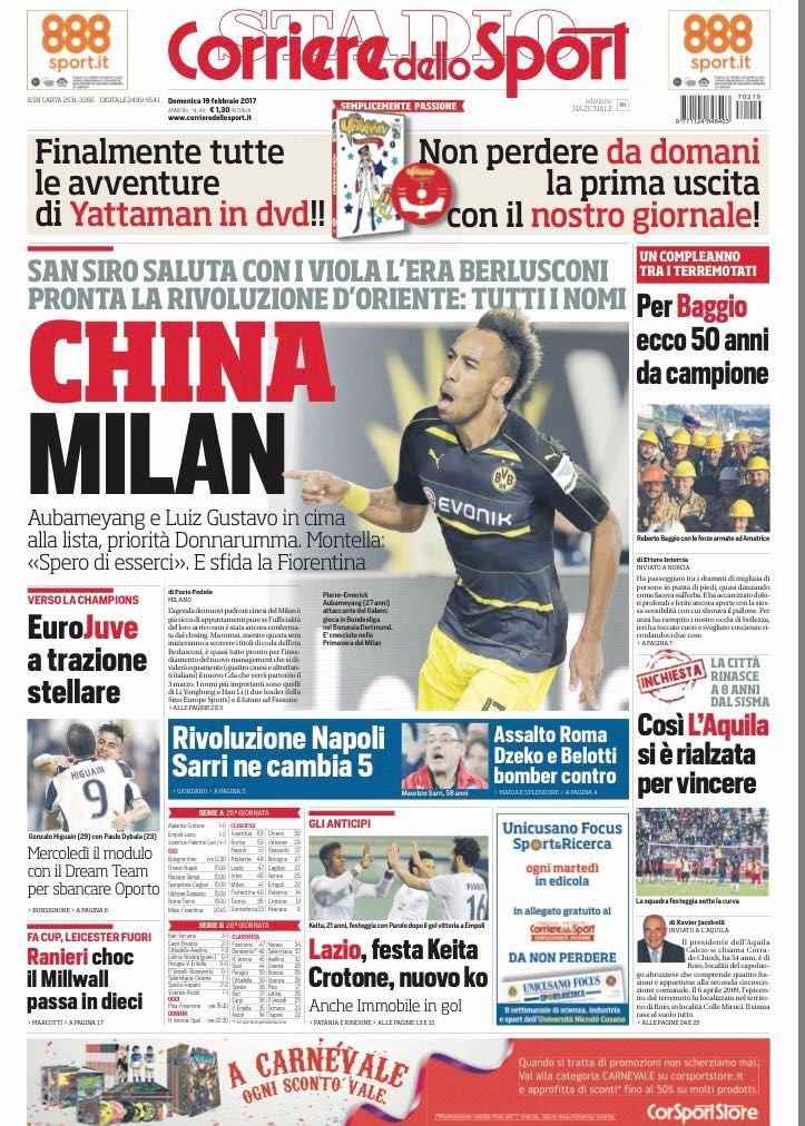 Il Corriere dello Sport titola con “China Milan“, ricordando come quello tra Fiorentina e Milan possa essere l’ultima partita di Berlusconi come presidente. Vengono poi elencati i nomi sui cui la nuova dirigenza potrebbe puntare per il prossimo mercato. In taglio basso si parla di rivoluzione Napoli con Sarri che cambierà cinque giocatori per la trasferta di Verona con il Chievo.