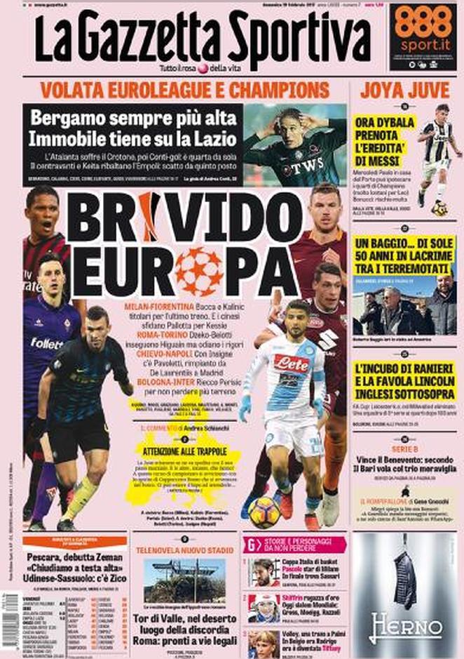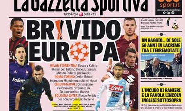 La Gazzetta dello Sport apre a tutta pagina con “Brivido Europa” elencando tutte le sfide di campionato che potrebbero decidere posizioni importanti per la Champions League ed Europa League.