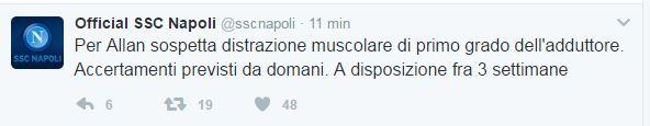 Durante la partita contro il Chievo Verona Allan è dovuto uscire per infortunio. Il cambio era stato chiesto direttamente dal calciatore ma non era chiara l’entità del problema. La SSC Napoli ha appena comunicato un aggiornamento sulle condizioni del mediano: