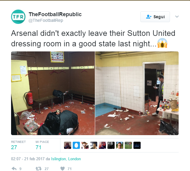 Il match di ieri sera è terminato col punteggio di 2-0 per i Gunners, con un eroico Sutton United che nel finale ha colpito una traversa avvicinandosi al riaprire la gara. E, come previsto, i compagni di squadra di Alexis Sanchez non hanno apprezzato la qualità degli spogliatoi e delle docce, tanto da lasciare lo spogliatoio in condizioni impietose. Ed oggi hanno regalato, in maniera parecchio narcisista e forse imbarazzante, 50.000 sterline al Sutton United per rifare lo spogliatoio.