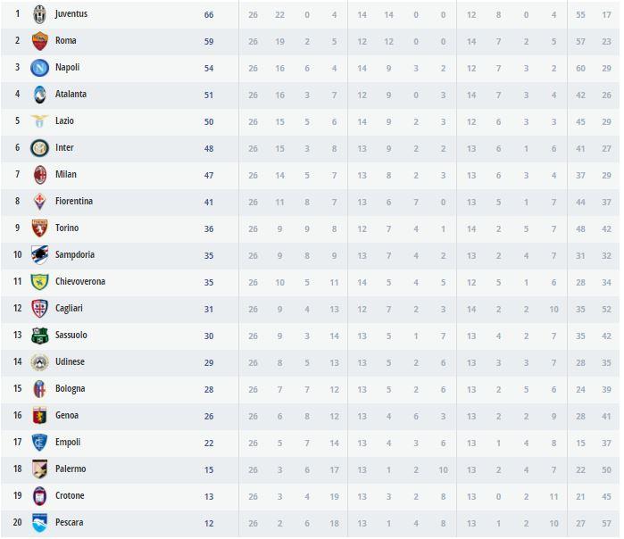 La Juventus e la Roma oramai corrono. Il Napoli lontano al terzo posto. La Fiorentina intanto crolla a -6 dal Milan mentre la sconfitta dell’Empoli riapre la lotta per la salvezza.