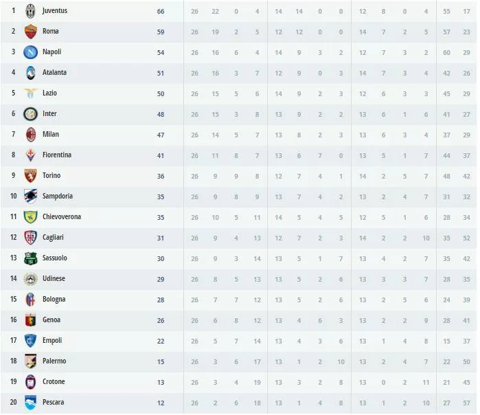 La Juventus e la Roma oramai corrono. Il Napoli lontano al terzo posto. La Fiorentina intanto crolla a -6 dal Milan mentre la sconfitta dell’Empoli riapre la lotta per la salvezza.